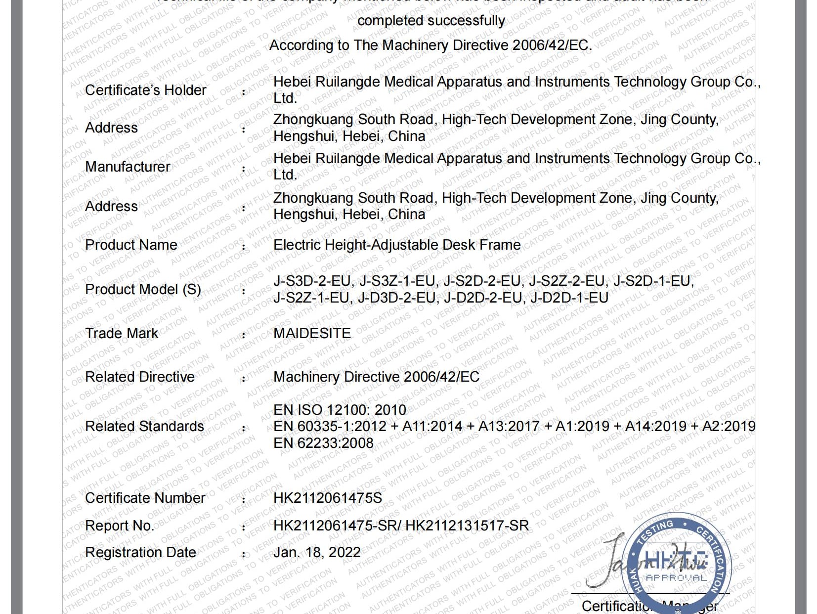 - Con certificaciones como CE, UKCA y FSC, garantizamos que nuestros escritorios ajustables Maidesite son funcionales y cumplen con la mayoría de los estándares de escritorios de oficina.